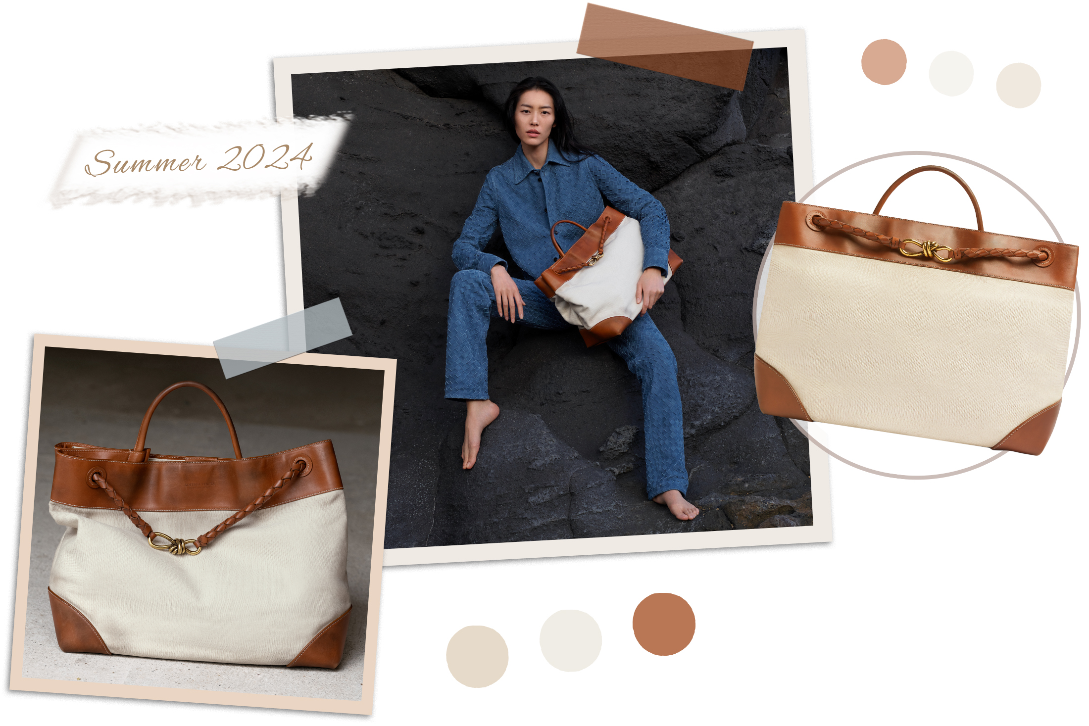 In the following summer of 2024, the Andiamo, in brown and beige tones, continued to work its charm in a mix of washed Bristol calfskin and canvas. A little bit of background on Bristol calfskin – this leather, sourced in France, undergoes a unique ageing, washing and manual brushing process that gives it a natural look with a firm structure that is gentle to the touch. The choice of leather thus provides a textural contrast to the heavy-duty canvas.