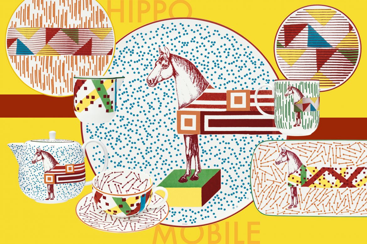 Inspired by jockey silks and the world of cartoons, the tea service is made up of pieces that can be freely paired and combined according to one’s whim and fancy. The Maison’s emblematic mascot, the horse, is present in a most playful motif, stretching over three plates, popping up from within a cup, and wrapped around a teapot.