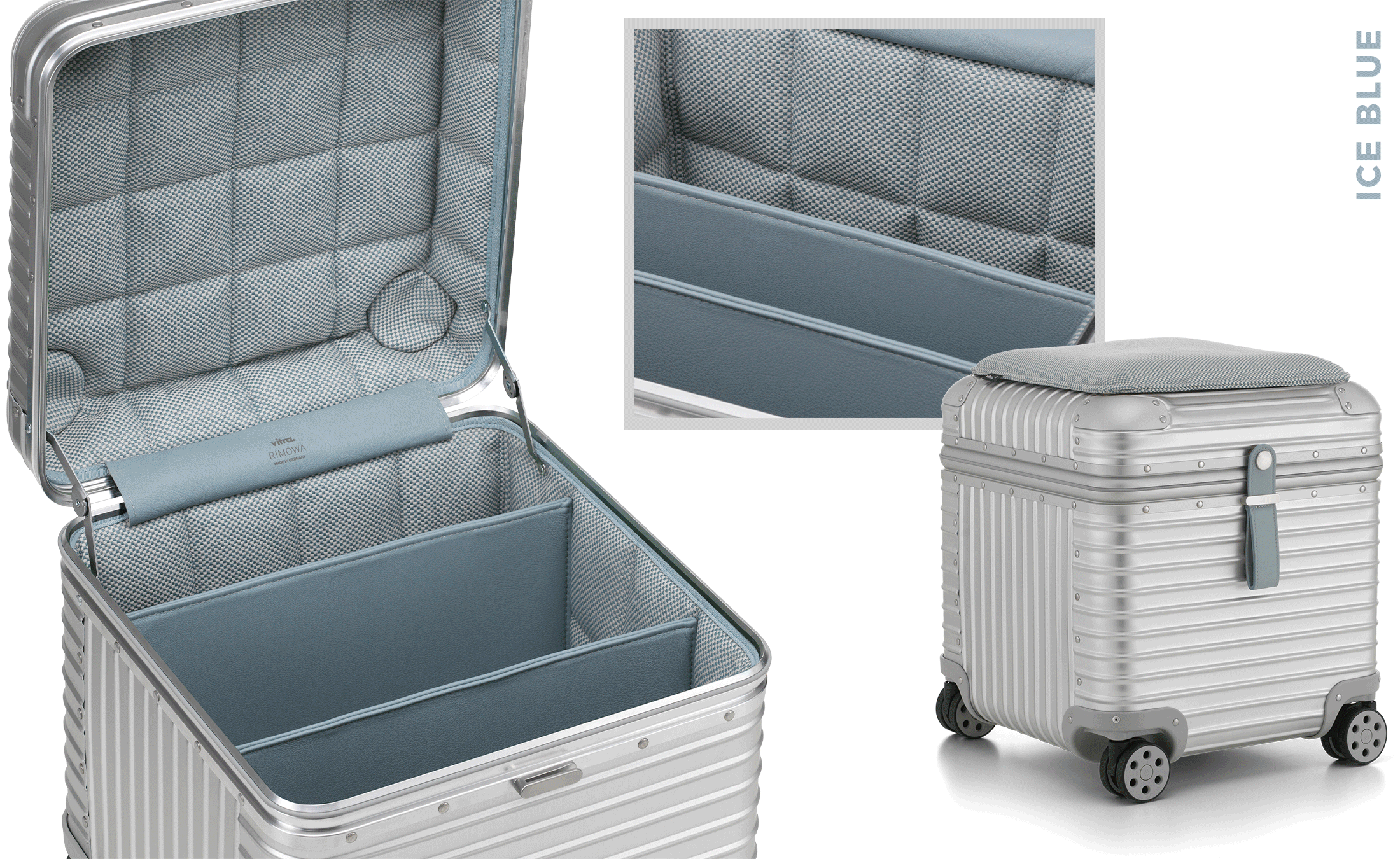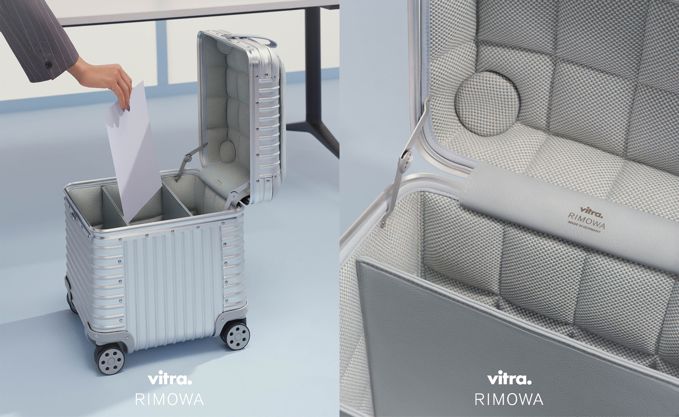 The aluminium components by Rimowa are produced at their historic headquarters in Cologne, while Vitra’s upholstered textile elements are manufactured on the Vitra Campus in Weil am Rhein.