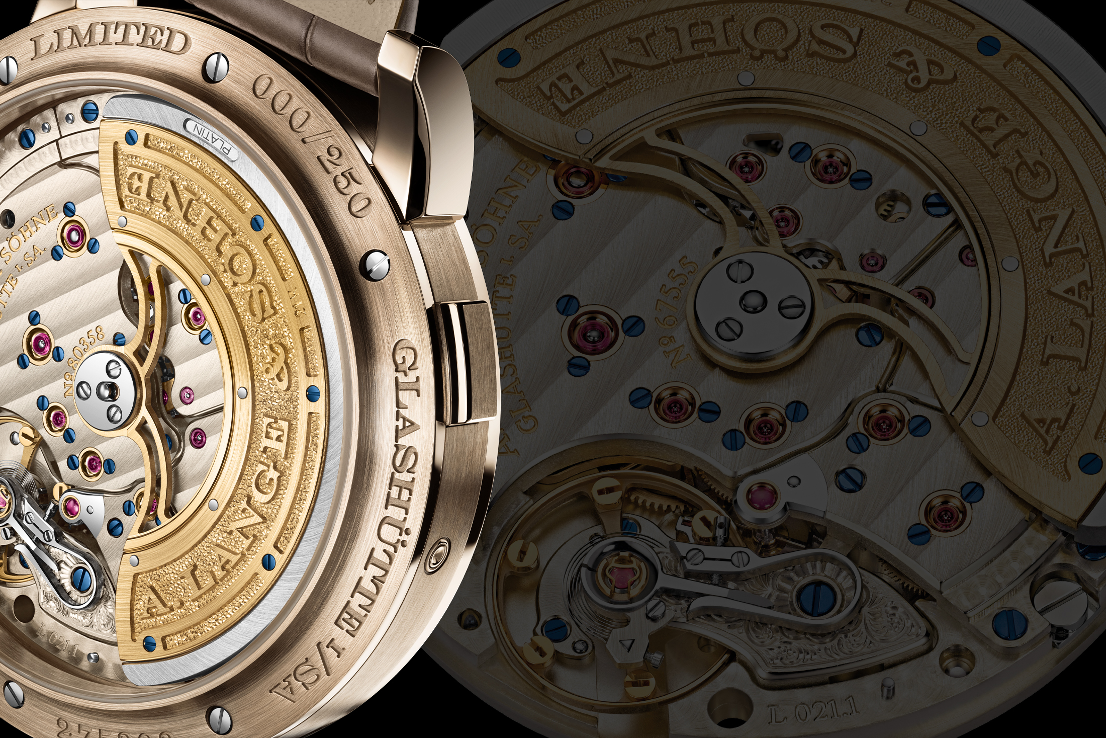 In true Lange tradition, the 426-part L021.1 movement is assembled twice and finished traditionally with features such as the hand-engraved balance cock, Glashütte ribbing and screwed gold chatons visible through the caseback.