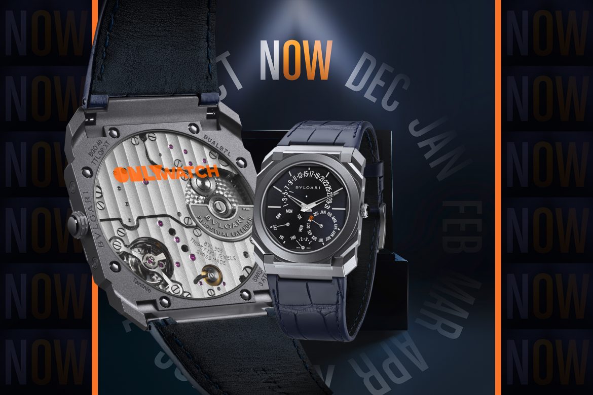 For its first participation, Bvlgari has created the Octo Finissimo Perpetual Calendar Tantalum. Its unique, handsome bluish-grey tantalum 40mm case is complemented by a deep blue lacquered dial where the Only Watch abbreviation is marked in a symbolic shade of colour for the month of November.
