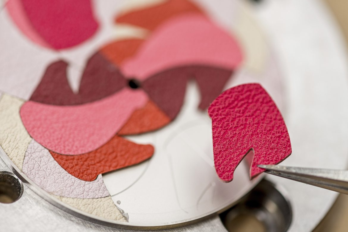 The leather marquetry for the dial requires a meticulous approach. Each leather piece, of full grain calfskin, is first split to a thickness of a mere 0.5 mm before each element composing the motif is precisely cut to the patterned size and shape. Each element is then fitted on the dial piece by piece by the artisan to exacting perfection. The art of leather miniature work at its best.