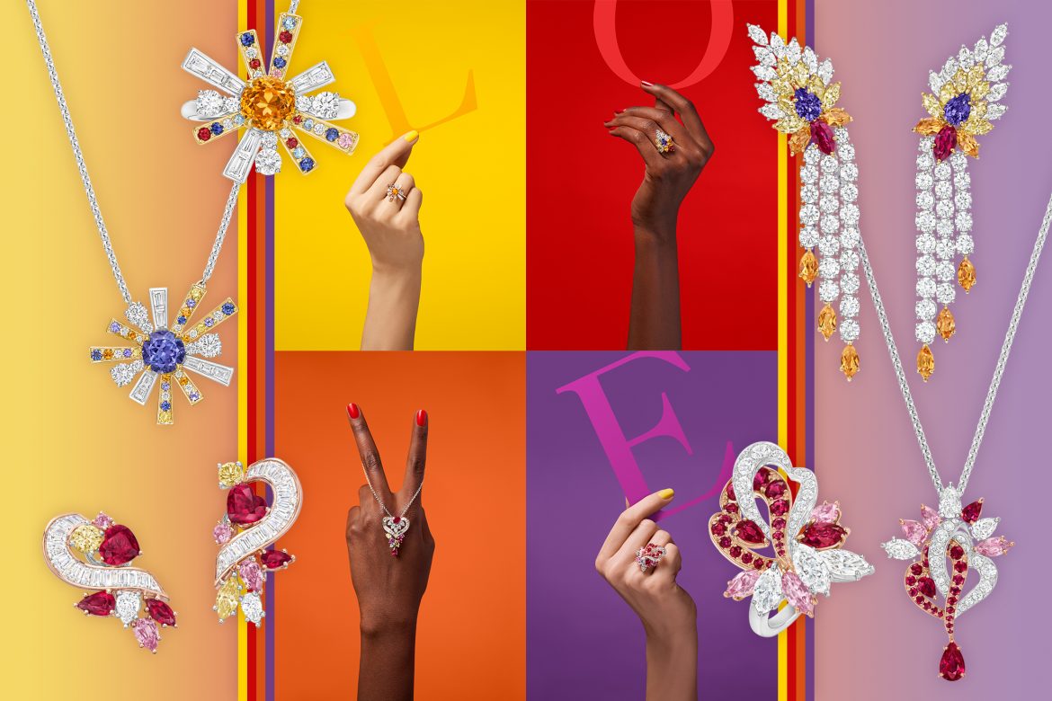 This chapter also includes “Flare”, a series of highly dimensional earrings and rings in three colourways, featuring a mesmerising combination of coloured gemstones and diamonds, constructed using the complex technique of mixed metal pave, speaking to the House’s expertise in gem-setting.