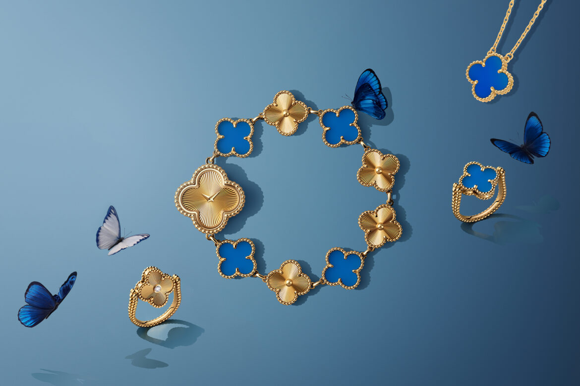 Striking blue agate re-enters the Alhambra universe at Van Cleef & Arpels after its debut in 1989. The translucent chalcedony used in the collection is chosen for its lustre, purity in material, and intensity in colour, then polished with care, taking into consideration the microcrystalline structure of the gemstone. Each piece is unique, with slight natural variations in opacity, exuding their individual charm, the beaded contour defining the border of the clover motif.